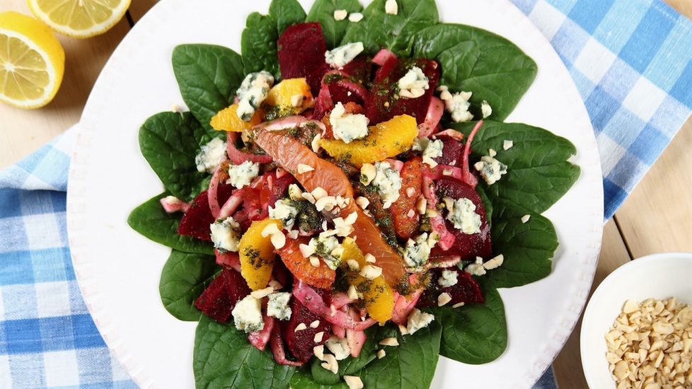 4. Do sosu dodaj buraki, łososia, koper i pomarańcze i wszystko dokładnie wymieszaj. Liście szpinaku ułóż na dużym płaskim talerzu, na szpinaku umieść sałatkę, całość udekoruj orzechami i kawałkami sera pleśniowego.