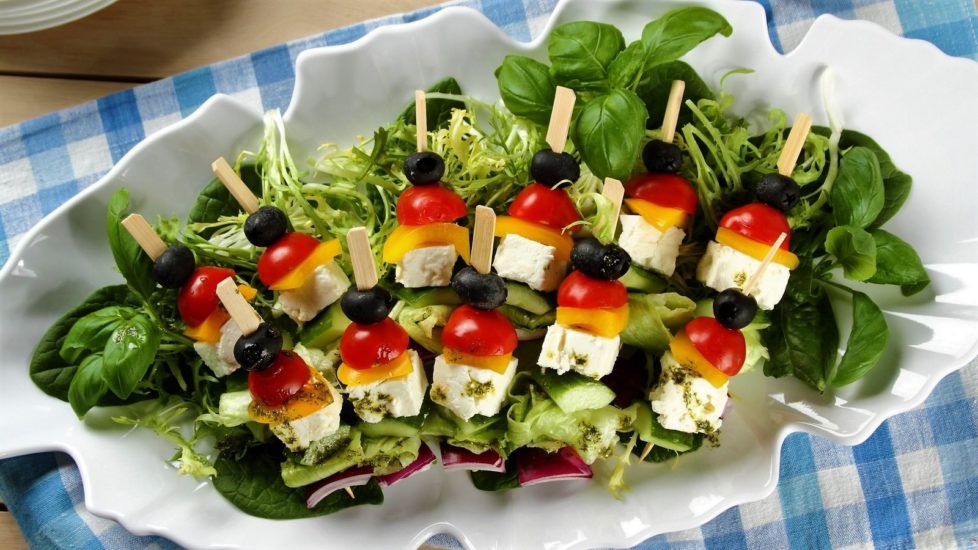 3. Liście sałaty zroluj i przekłuj wykałaczką. Na wykałaczkę nadziewaj na przemian: czerwoną paprykę, ser feta, ogórka, czerwoną cebulę, żółtą paprykę, czarną oliwkę. Każdy „szaszłyk” z osobna polej dresingiem i ułóż na półmisku.