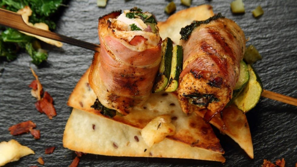 4. Na plaster zamarynowanego indyka nałóż podsmażony jarmuż, kawałek ogórka i oscypka. Całość ściśle zroluj, zawiń w szynkę parmeńską.