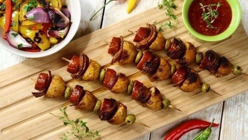 3. Szaszłyki grilluj na tackach aluminiowych, na średnio rozgrzanym grillu około 20 minut, przekręcając je co jakiś czas. Gotowe szaszłyki podawaj z sosem chilli Hellmann‘s.