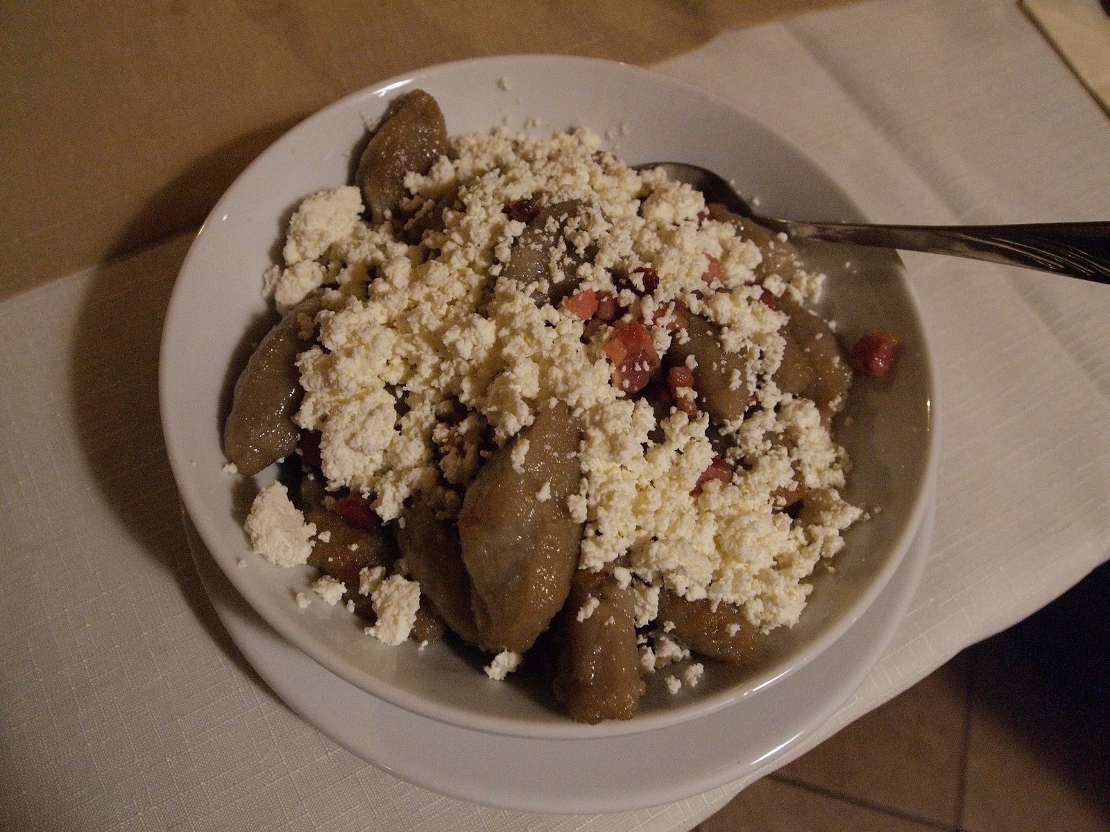 Tematem głównym kolacji był mazowiecki ziemniak. Na dobry początek pojawił się gorący rosół z gęsiny podany z pieczonym ziemniakiem i szczypiorem. Następnie: placki ziemniaczane (zwane tutaj o dziwo racuchami) z sosem kurkowym, cepeliny z kapustą i grzybami polane cebulką na maśle. Z pieca chlebowego podano rejbak kurpiowski czyli babkę ziemniaczaną, po niej zaś specjał Gąsiorowa – przecieraki ze skwarkami i wiejskim twarogiem. Na stołach obecna była również sałatka ziemniaczana z kiszonym ogórkiem, a na zakończenie kolacji pojawiły się pieczone w ognisku ziemniaki, a do nich ziołowe masło. Mojemu podniebieniu najbardziej przypadły do gustu placki ziemniaczane z sosem z kurek i smakowity rejbak, ale to oczywiście subiektywna opinia. Zdecydowanie polecam samodzielne przetestowanie ww. specjałów. Autorem wszystkich ziemniaczanych fantazji był szef tutejszej kuchni – Jacek Machnacz. Chapeau bas! Eeeeeh, niebo w gębie było, aż miło powspominać…