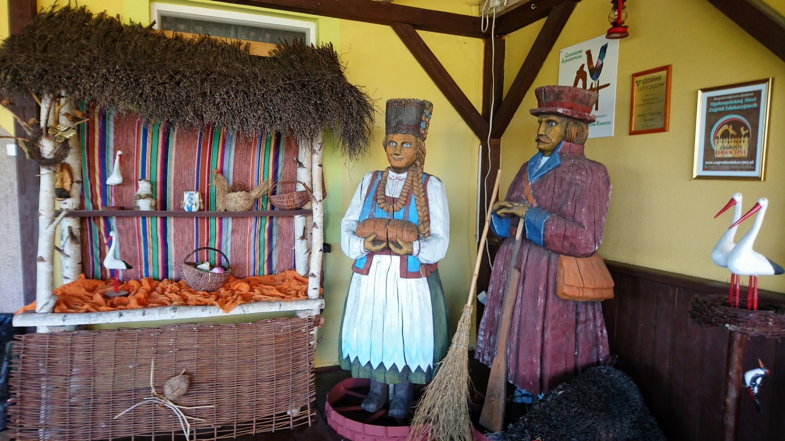 Kuchnia jest wyśmienita i w pełni autorska, choć nawiązuje często do tradycji kurpiowskich. A skoro jesteśmy na Kurpiach, to nie zabrakło też lokalnych elementów w wystroju. Bo przecież wszyscy znają wycinanki kurpiowskie a szlagierem są drewniane rzeźby Kurpia i Kurpianki, gdzie prawie wszyscy robią sobie selfie. Nawet tablica z powitaniem i na do widzenia – też są po kurpiowsku.